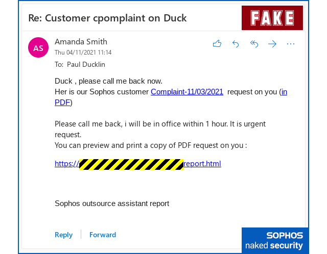 It looks as though they’d mixed up the emails and the web links of two different spear-phishing campaigns, one to do with customer complaints, and the other to do with accounts receivable or finance.