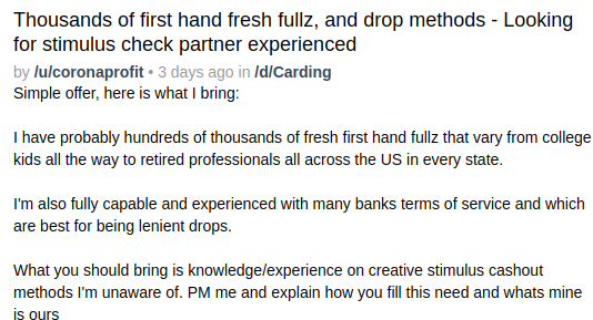 Figure 2. Threat actor seeking a partner for stimulus fraud. (Source: Secureworks)