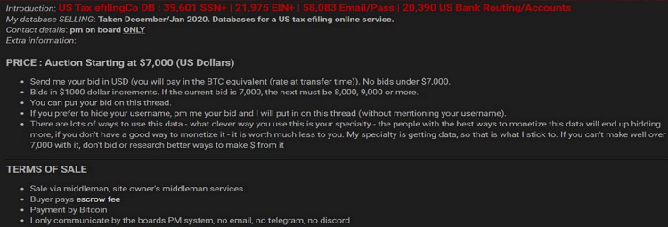 Some cybercriminals directly collect the victims’ data via phishing pages or social engineering, while others purchase databases of fullz and account information advertised on underground forums. Figure 5 advertises an auction for a database that could allow a buyer to create 40,000 more tax profile data packages.