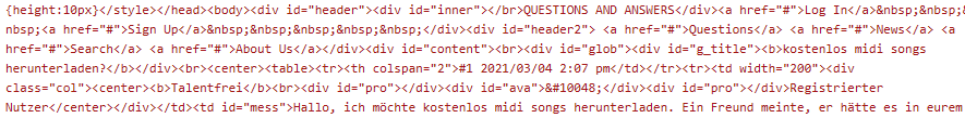 The result will look like a conversation on the blog, with a link of the alleged search term (“kostenlos midi songs herunterladen” in this example), and a seemingly satisfied customer, together with the download link of the first stage JavaScript downloader.