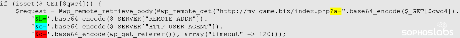 On preparing the requested web page, the malicious event handler hooks build a request to the mothership, reporting the following parameters of the initial request, all in base64 encoded form: