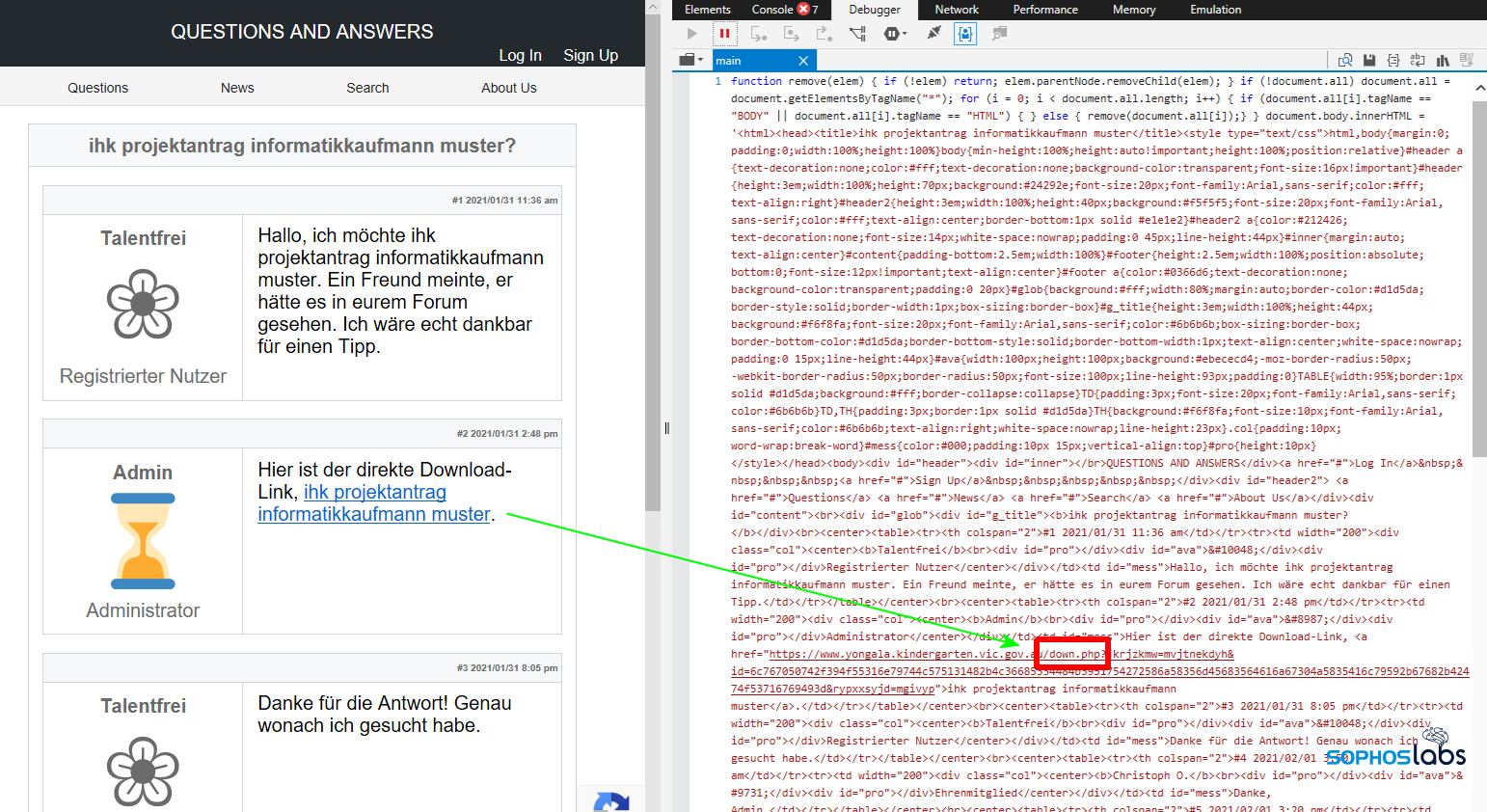 This link will connect to the server that is hosting the first stage download script, which is usually somewhere other than the compromised WordPress site hosting the bogus forum page content.