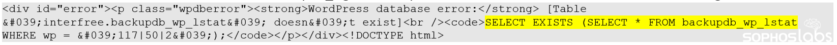 A Virustotal search for content:”SELECT * FROM backupdb_” gives a couple of files (from interfree.ca) with this error message: