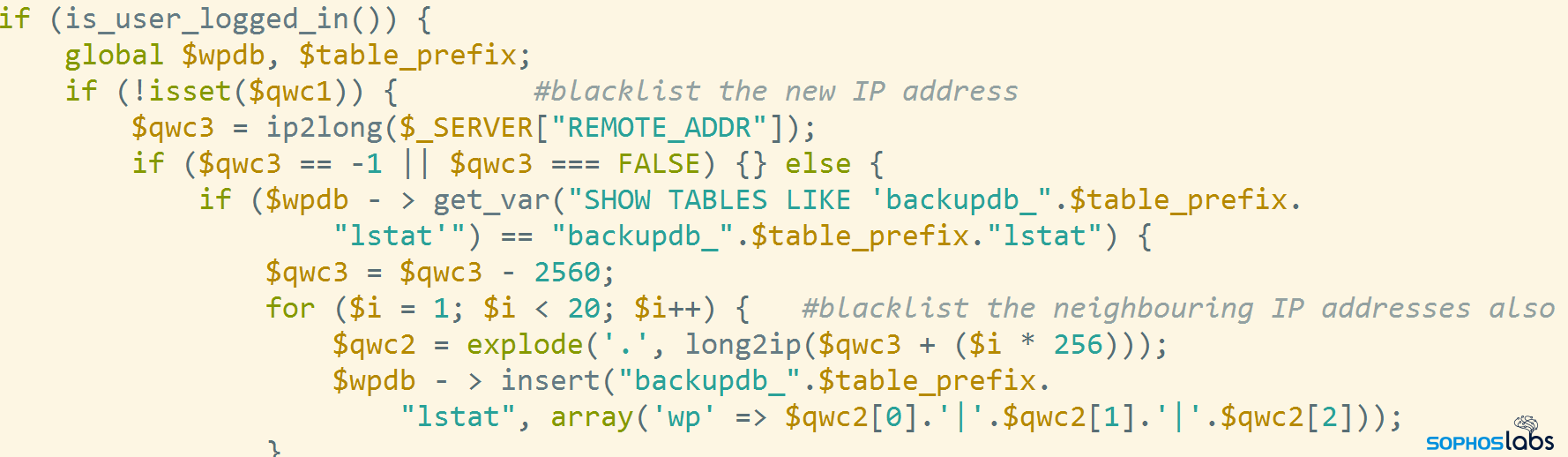 The script generates a blocklist on the fly when the visitor first visits the web page. This functionality blocks the IP address where the request came from (so a researcher, for instance, cannot easily visit the site twice from the same machine). But it doesn’t only block the one IP address; They also block repeat visits by a range of IP addresses in the same subnet as the visitor.