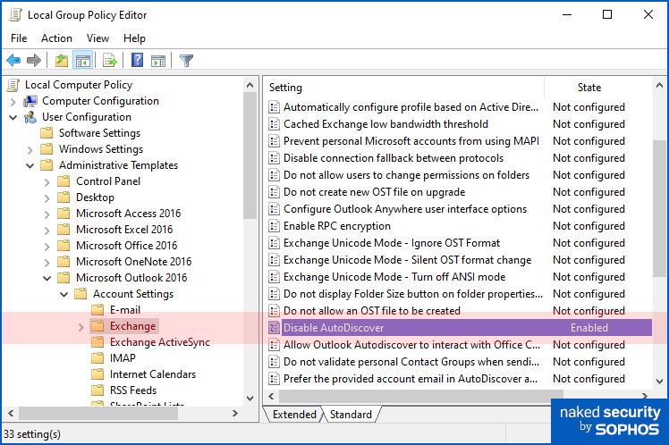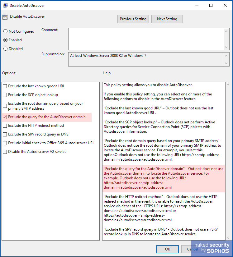 As simple as the Group Policy workaround might sound, and as much as Microsoft’s own help file for Office group policy settings seems to reassure you that the setting we’ve listed will suppress the use of “autodiscover” domain names…