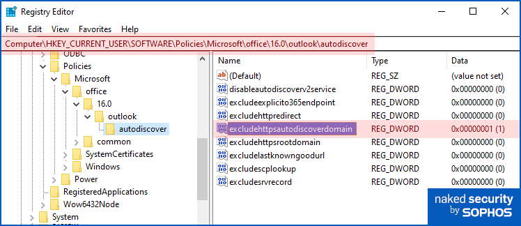 The bad news is that, even after setting the excludehttpsautodiscoverdomain option, we nevertheless observed Outlook 2016 trying to locate autodiscover.naksec.test in our experiments. (We also tried with realistic external TLD and 2LD domains, e.g. .fr and .co.za.)
