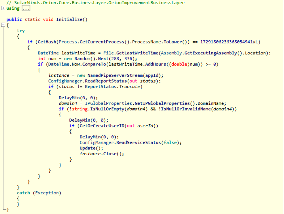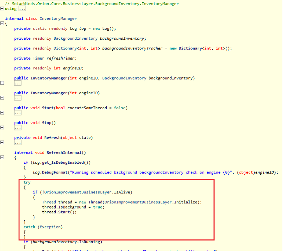 Code injected into InventoryManager.cs which initiates the Sunburst backdoor.