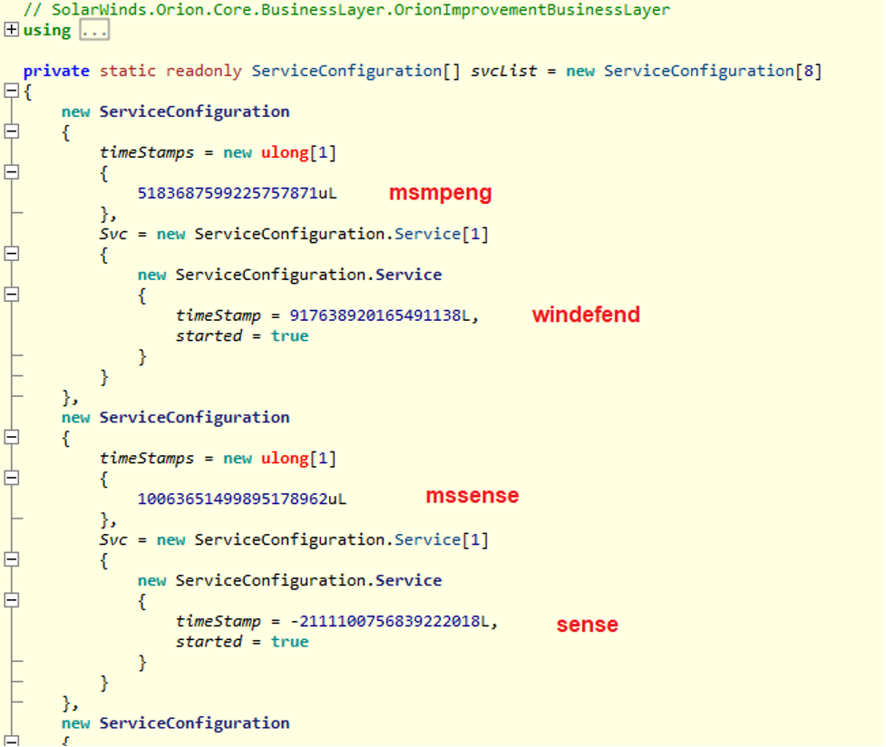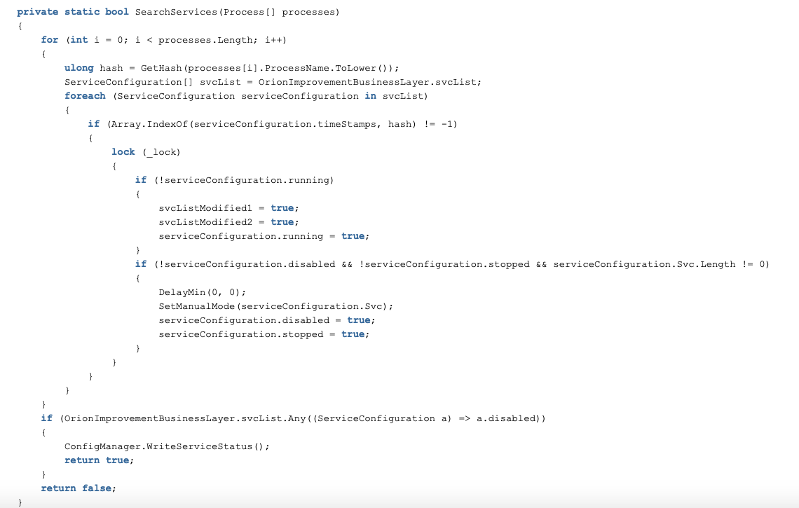 If any service is disabled in this process, ConfigManager.WriteServiceStatus() is called, which writes packed data into an application settings file ( SolarWinds.Orion.Core.BusinessLayer.dll.config), storing the matched service entry. For example:…<add key=”ReportWatcherPostpone” value=”255″/>…If no services are detected or disabled, and SearchAssemblies() found no processes from the blacklist, SearchConfigurations() is called—which checks installed drivers against 17 pre-calculated hashes.
