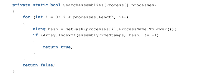 The hashes are checked against the hashes of the lower-cased names of processes.If SearchAssemblies() does not find a process name match, the TrackProcesses() function calls SearchServices().