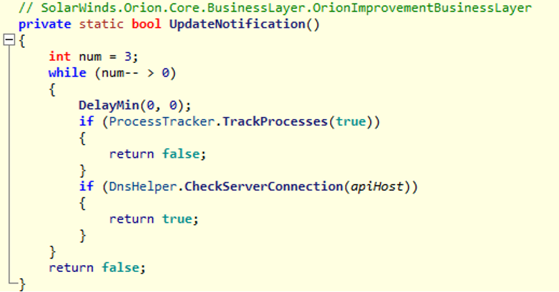 Sunburst checks against the environment it is running in via the ProcessTracker.TrackProcesses() function. This function is called from three places, two of them in the main flow of the backdoor’s execution: