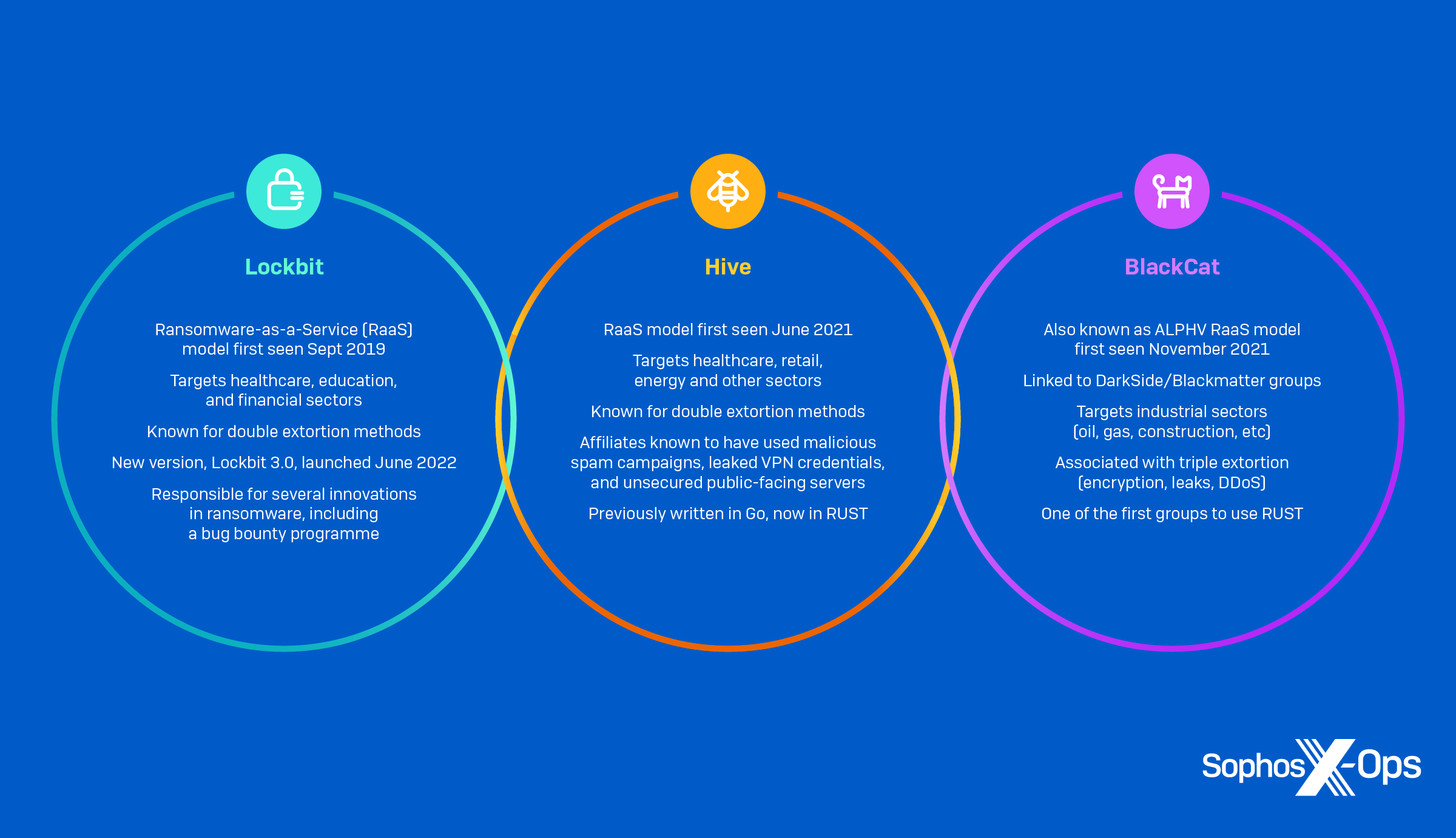 Sophos X-Ops has posted IOCs relating to the Lockbit, Hive, and BlackCat attacks covered in this report on our Github repository.