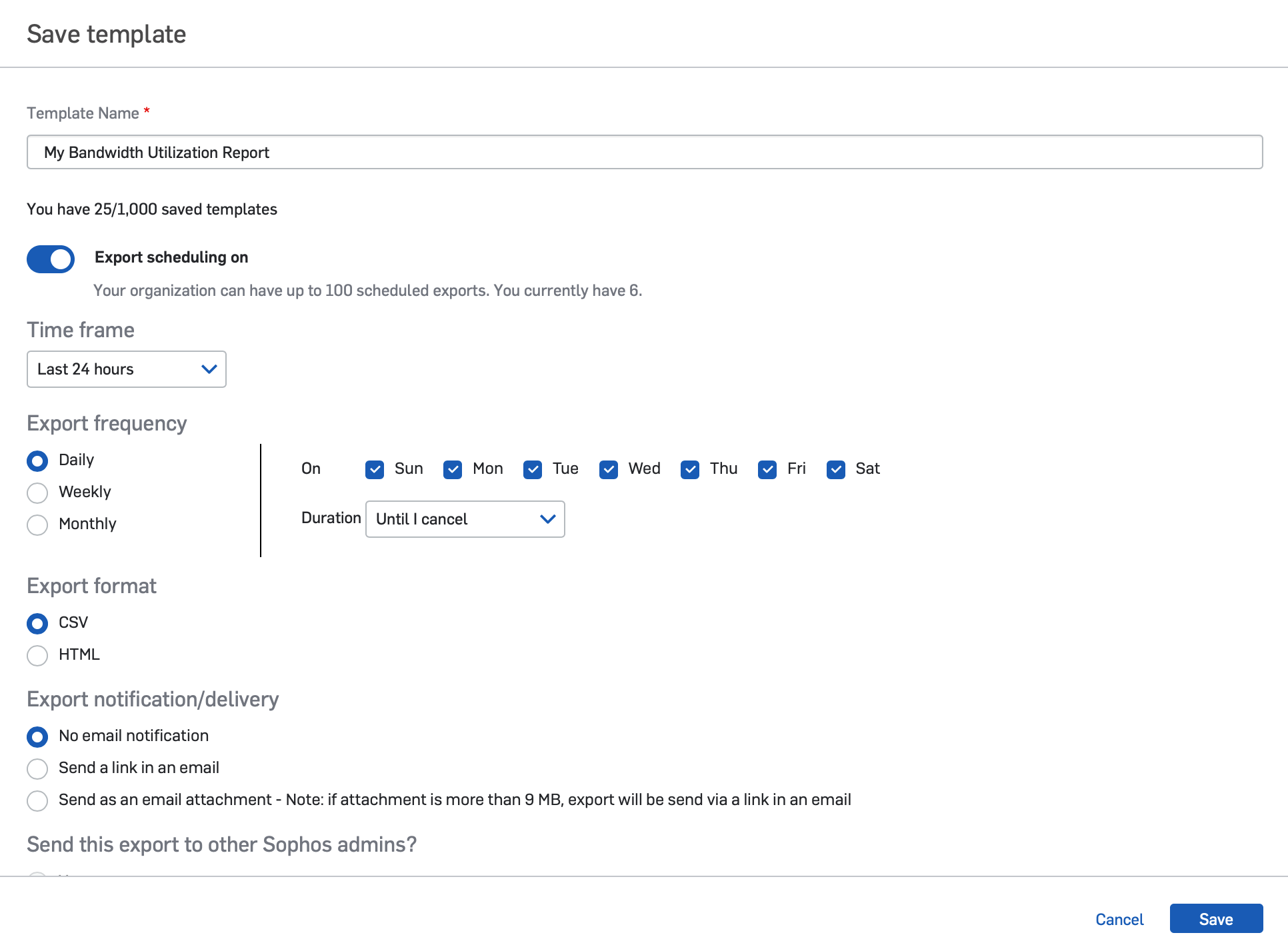 - Export your reports – Reports can now be exported in HTML, CSV, and (coming next month) PDF formats. As an additional bonus, the exported reports provide up to 100,000 records in a report, whereas the interactive reports in Central are limited to 10,000 records. Download your favorite report for offline viewing directly from Sophos Central or have it delivered to your inbox.