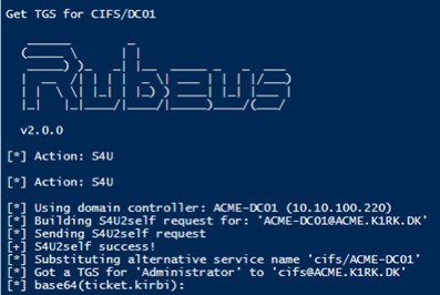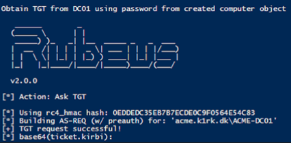Figure 2. Successful ticket request for spoofed domain controller. (Source: Secureworks)Request a Kerberos ticket granting service (TGS) for the Lightweight Directory Access Protocol (LDAP) service using the TGT from step two with the name of the spoofed domain controller from step one. Because there is no longer an account with that name, TGS chooses the closest match and appends an $. Access to the service is granted, and domain administrator access is acquired (see Figure 3).