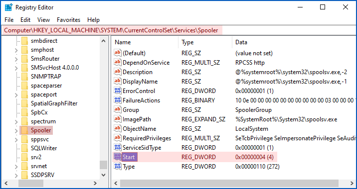 sc start Spoolerornet start Spoolercan be used to start up the Spooler on demand. - 4 = Disabled. Refuse to start even if asked.