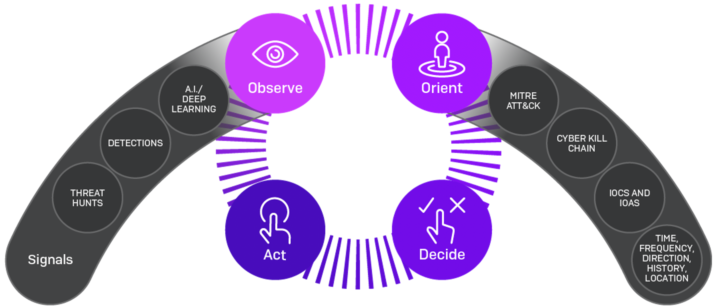The OODA loop is a military concept that enables our team to go through a cycle of reasoning to fully understand the event and surrounding behaviour. They can then build off this knowledge as well as employ human decision making and intuition to conclude whether malicious activity is present within a customer environment. The analyst can then act on the back of this investigation.
