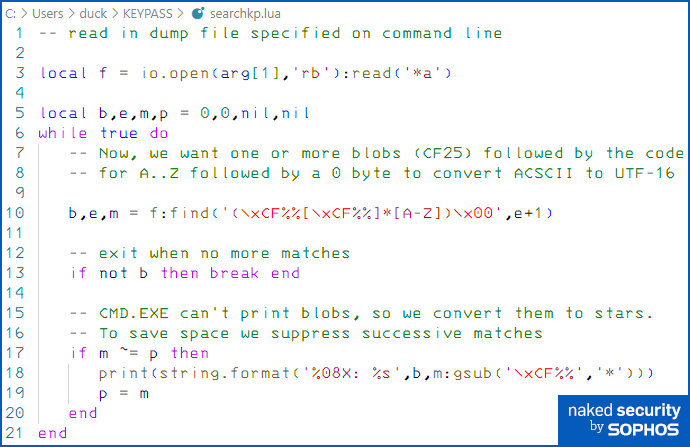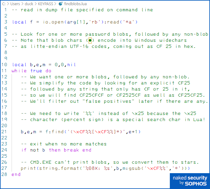Simply put, the CVE-2023-32784 vulnerability means that a KeePass master password might be recoverable from system data even after the KeyPass program has exited, because sufficient information about your password (albeit not actually the raw password itself, which we’ll focus on in a moment) might get left behind in sytem swap or sleep files, where allocated system memory may end up saved for later.