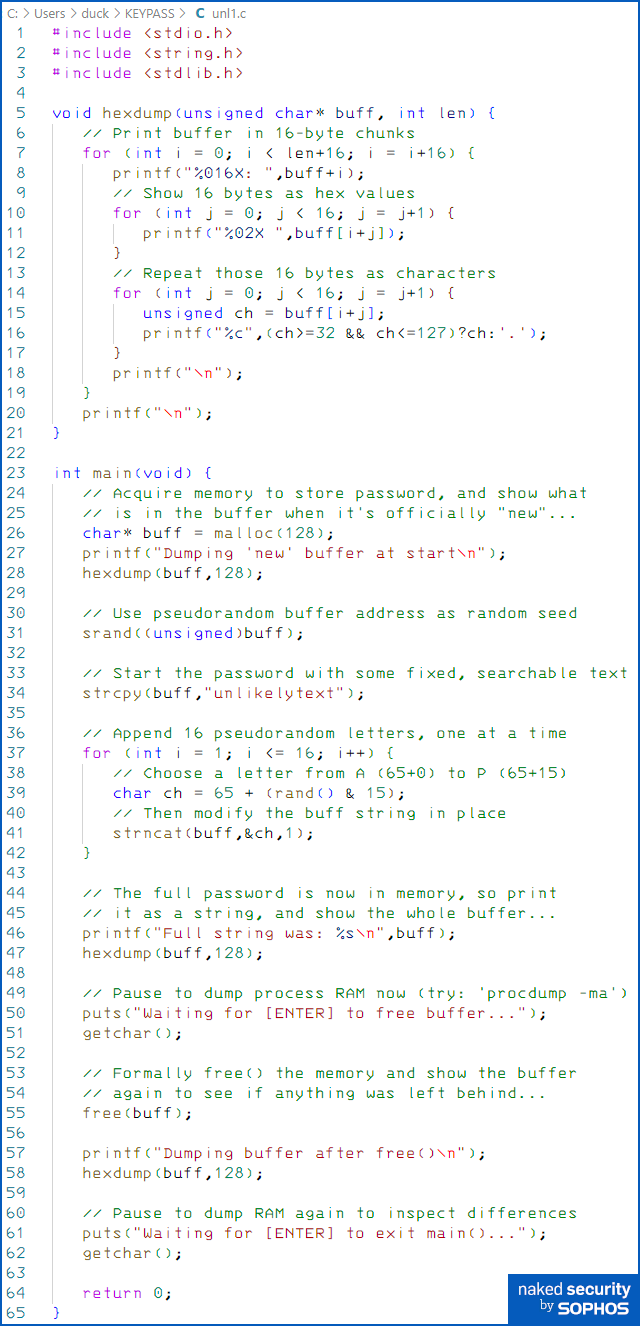 In fact, the code we finally used in our tests includes some additional bits and pieces shown below, so that we could dump the full contents of our temporary password buffer as we used it, to look for unwanted or left-over content.