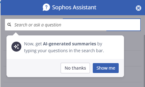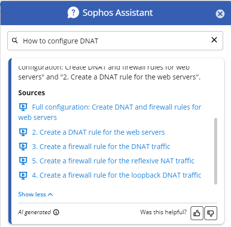 A new generative-AI powered Sophos Assistant is built in to help you with managing your firewall. You can ask the assistant any plain-language question and the assistant will provide instructions and links to helpful resources.