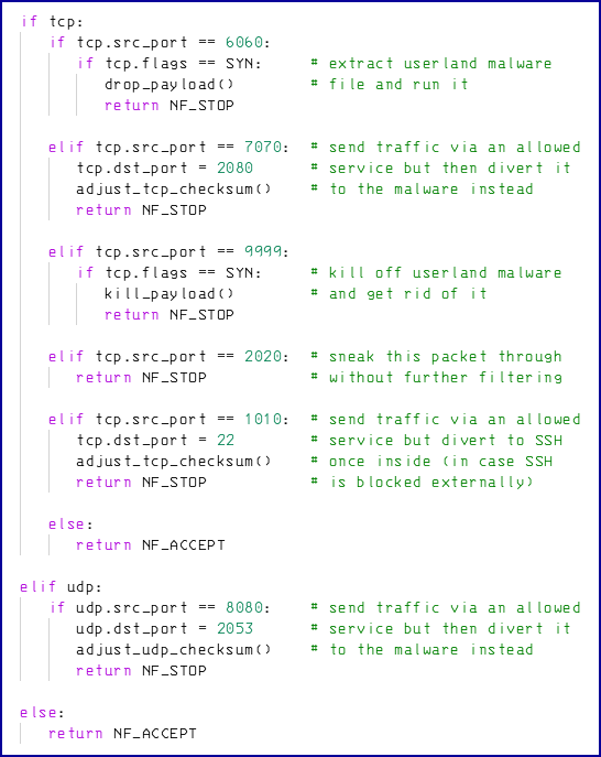 There are five TCP source port numbers that the driver watches out for, and one UDP source port number. Ironically, leaving just TCP source port 9999 unblocked would allow any “kill payload” commands to get through, thus allowing the crooks to stop the malware but not to start it up again.
