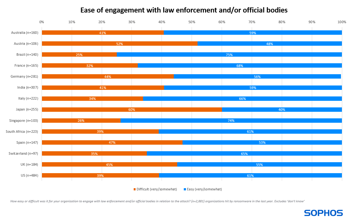 Ease of engagement also varies by country. Those in Japan were most likely to find reporting difficult (60%), followed by those in Austria (52%). Japanese respondents also had the highest propensity to find it “very difficult” to report the attack (23%). Conversely, respondents in Brazil (75%) and Singapore (74%) were most likely to find it easy to engage, while Italian organizations had the highest percentage that found it “very easy” (32%).
