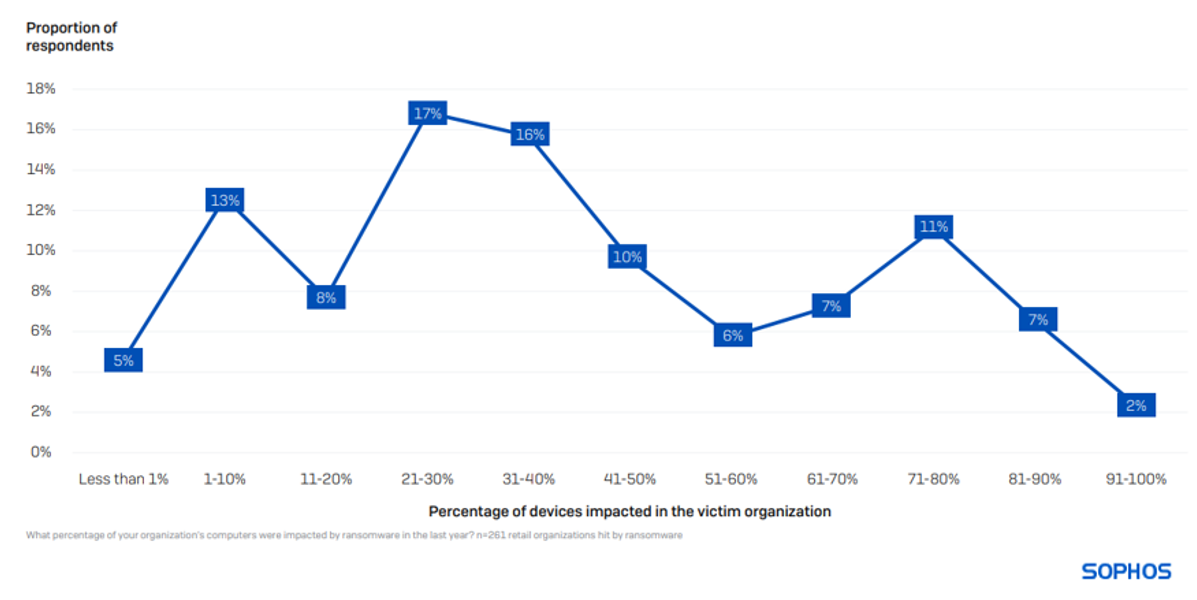On average, 40% of computers in retail are impacted by a ransomware attack. Having your full environment encrypted is extremely rare, with only 2% of organizations reporting that 91% or more of their devices were impacted.