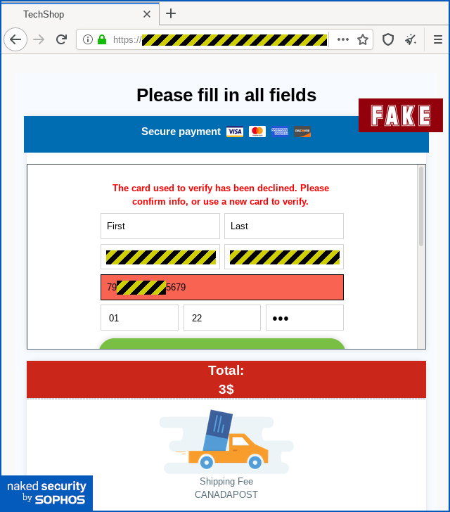 Above, we put in non-existent credit card information to see what would happen next – some phishing scams of this sort redirect you to a genuine page on the courier company’s or the card company’s real site in order to throw you off the scent – and we were presented with a bogus “card declined” message.