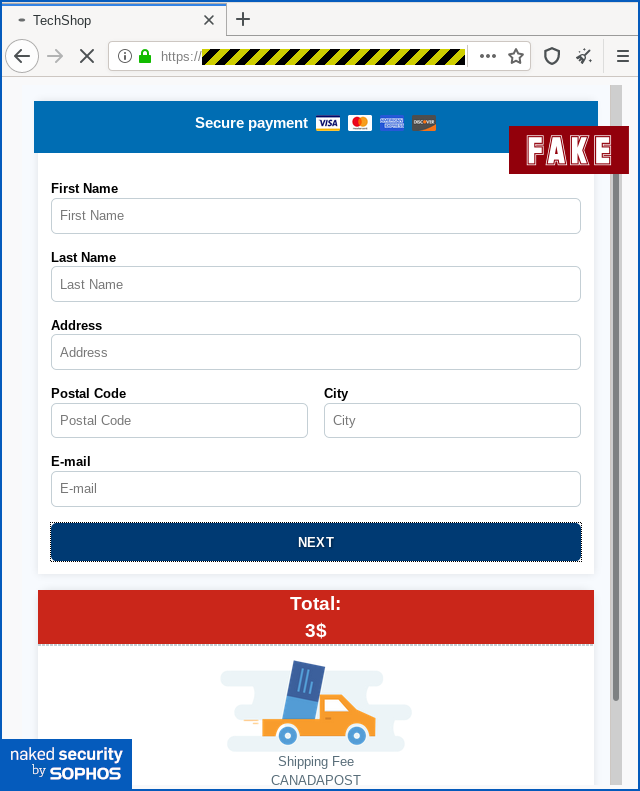 As you can see, the site has a reassuring HTTPS padlock, meaning that transmission to and from the site is secure, but the site itself is just a visual ripoff of the Canada Post/Postes Canada brand (this SMS was received by SophosLabs in Vancouver, BC):