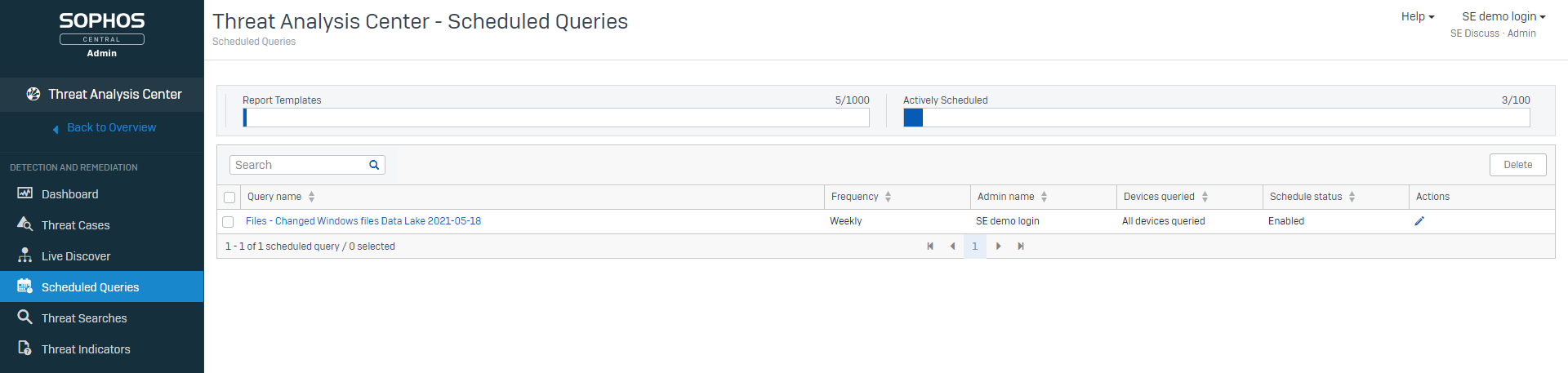 Scheduled queries are available now for Sophos Data Lake queries. Windows and Linux devices can use scheduled queries now with Mac support coming later this year. Scheduled queries for on-disk queries are coming later this year.