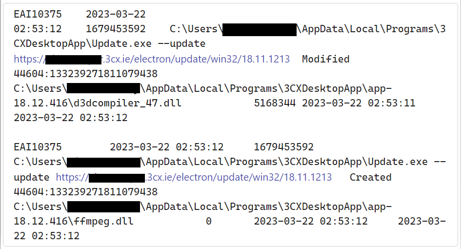Vimos varias variaciones del archivo ffmpeg.dll, incluida una que estaba firmada por el propio certificado de 3CX; parecen ser versiones parcheadas maliciosamente del ffmpeg.dll legítimo. En una declaración del jueves, el equipo responsable del código fuente de ffmpeg se esforzó por distanciar su trabajo del compromiso de 3CX.