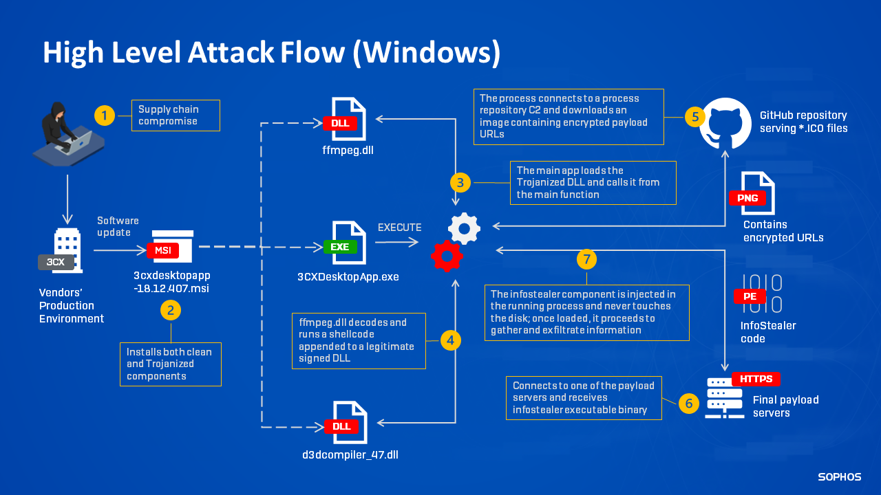 Sophos MDR identificó por primera vez actividad maliciosa dirigida a sus propios clientes y procedente de 3CXDesktopApp el 29 de marzo de 2023. Además, Sophos MDR ha observado que la campaña aprovecha un almacén público de archivos para alojar programas maliciosos codificados. Este repositorio ha estado en uso desde el 8 de diciembre de 2022. Después de que la noticia del compromiso se difundiera ampliamente el 29 de marzo, el repositorio fue retirado.