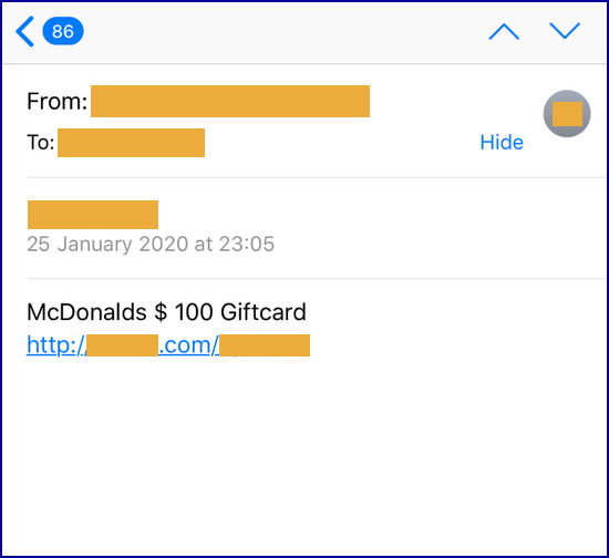 The other giveaway mistake by the senders of this email is that the amount is in dollars, yet we’re in the UK where a $100 McDonald’s voucher wouldn’t be redeemable.