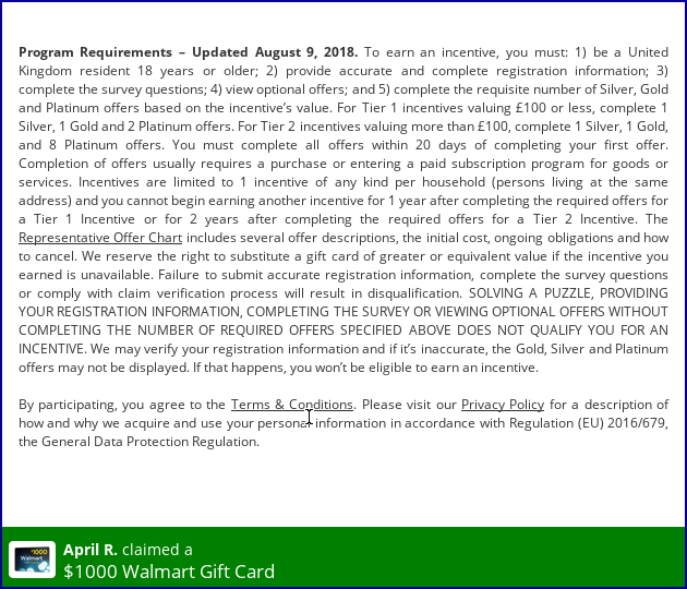 For […] incentives valuing more than £100, complete 1 Silver, 1 Gold and 8 Platinum offers. You must complete all offers within 20 days of completing your first offer. Completion of offers usually requires a purchase or entering a paid subscription program for goods or services. […] Failure to submit accurate registration information, complete the survey questions or comply with claim verification process will result in disqualification. […] We may verify your registration information and if it’s inaccurate, the Gold, Silver and Platinum offers may not be displayed. If that happens, you won’t be eligible to earn an incentive.