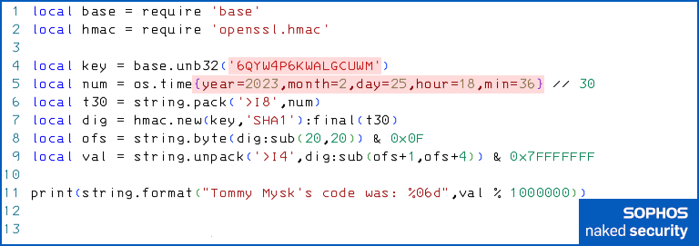 You can prove this to yourself by using the TOTP algorithm we presented earlier, and feeding in [A] the “secret” string from Tommy Mysk’s tweet above and [B] the time he took the screenshot, which was 7:36pm Central European time on 2023-02-25, one hour ahead of UTC (Zulu time, denoted Z in the timestamp below).