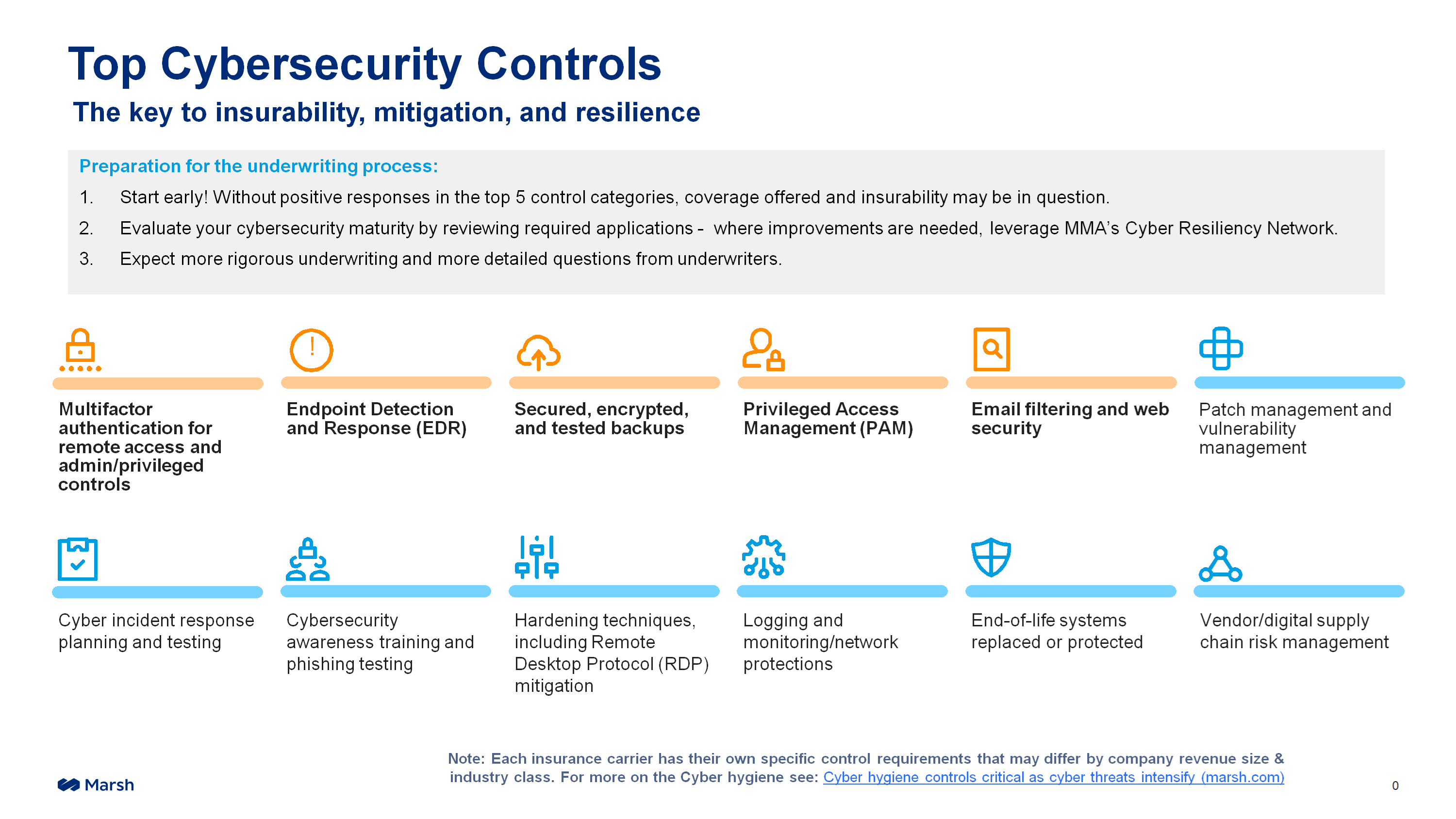 The first step toward getting cyber insurance: make sure you can get cyber insurance. According to leading cyber insurance broker Marsh McLennan Agency, the following security controls are must-haves…