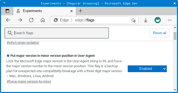 Chromium browsers, likewise, introduced a special flag dubbed force-major-version-to-100 (visit chromium://flags or edge://flags to find it) so testers could try out a version number of 100 ahead of time.