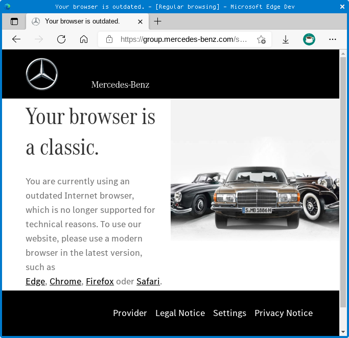 We installed Edge-dev, and tried one of the sites recently reported in the Webcompat V1H list, namely daimler.com, which redirected us to a Mercedes-Benz page that decided our three-digit browser version was way out of date, rather than brand new: