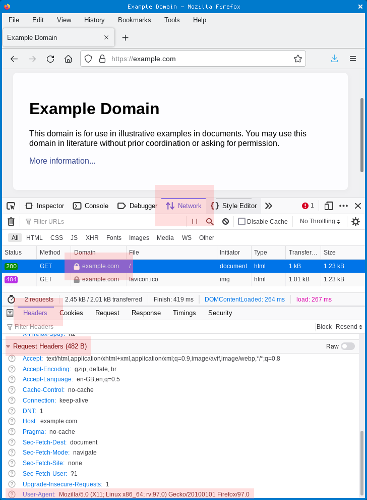 The first is to use your browser’s Developer Tools (try Ctrl-Shift-I), open the Network tab and then visit a website – the content of each outgoing HTTP request, including headers, and its related HTTP response, gets logged for you and can be examined at your leisure.