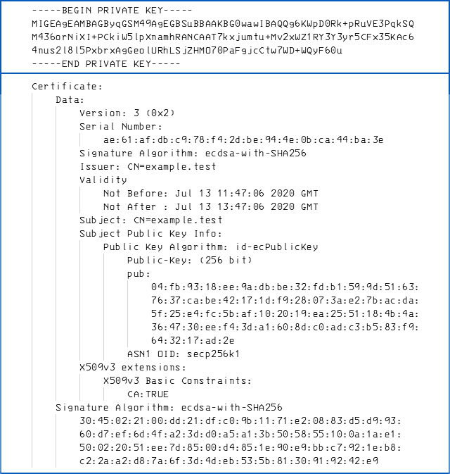 Here, we’ve used OpenSSL, via a simple series of Lua script commands, to produce a public/private keypair, put the public key into a web certificate, make the certificate valid for 7200 seconds (two hours), and set the certificate to be authoritative.