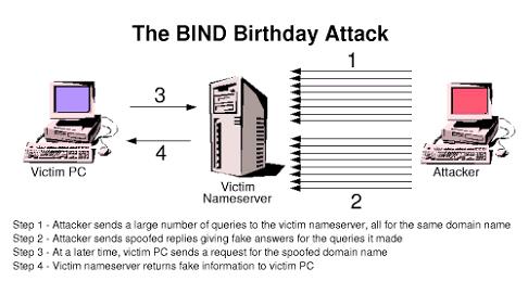 I have written the following program to demonstrate the feasibility of the BIND Birthday attack. It is a passive demonstration only; it cannot be used to execute an actual attack. It will send n number of queries to a recursive server, while generating a ?spoofing set? which is just an array of psuedo-random numbers. If any of the transaction IDs of the recursive queries coming back from the targeted nameserver match a number in the spoofing set, an attack would have succeeded.