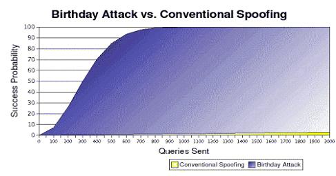 The power of this method of spoofing versus conventional DNS spoofing is shown in illustration 2. The birthday attack nears 100% success around 700 packets. At this point the conventional spoofing attack would only have a success probability of 700 divided by 65535 (1.07%) The steepness of the curve is such that one needs only 300 packets to achieve a 50% success ratio. This is well within the realm of a trivial attack to anyone with a broadband Internet connection.