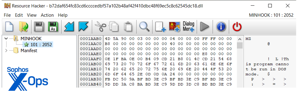También extrae el DLL Minhook de los recursos (SHA256: bddd6adaee8ab13eabaa7c73c97718cee1437db2054ca713ec7cc86e8002a300). El archivo DLL de este recurso es el mismo que el disponible en https://github[.]com/howmp/pyminhook/raw/master/minhook/MinHook.x64.dll .