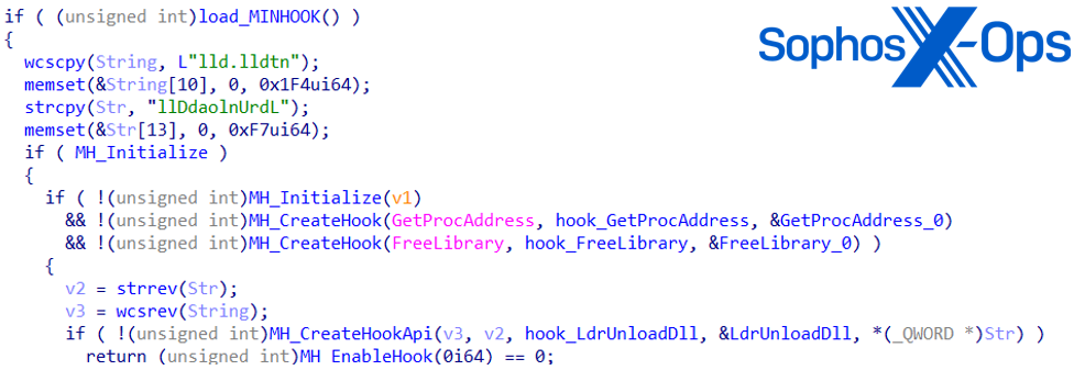 Otra característica común es el uso de la DLL Minhook; sin embargo, en este caso no la carga el cargador malicioso, sino el archivo de carga útil.