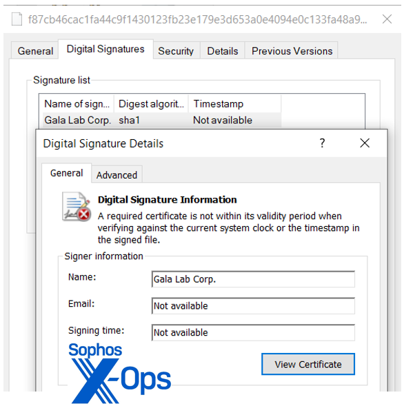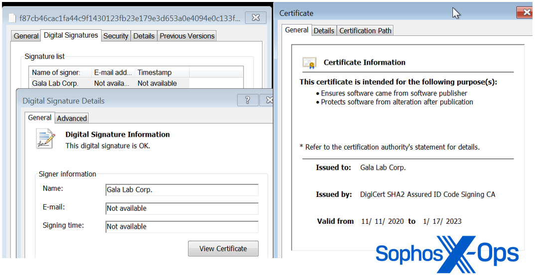 El instalador proporcionó otra sorpresa: estaba firmado digitalmente. La firma pertenece a Gala Lab Corp., una empresa coreana desarrolladora de juegos en línea. Aunque la firma ha caducado, se comprueba como válida si el reloj del sistema se retrasa hasta antes de la fecha de caducidad, a principios de 2023.