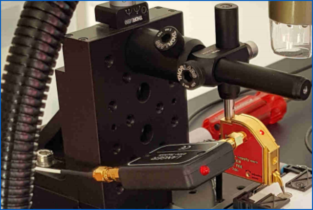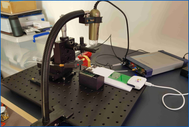 If we zoom into the picture of the snooping rig, you can see both the electromagnetic probe (the metal spike emerging from the red-and-gold box) and the precision positioning device (the black slab labelled “Thorlabs”):