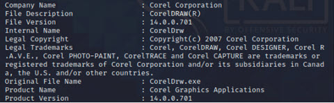 Figure 6. EXIF data associated with Cobalt Strike disguised as Corel Draw. (Source: Secureworks)