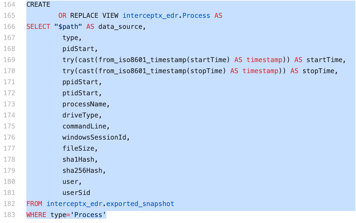 What this does is take the file path of the snapshot file in S3 and put it into a column called “data_source”. This ensures that when you are querying snapshots from different machines, you can identify which one of them it came from. This is the reason we mentioned having a good naming convention for each of your snapshot files. If you can’t tell which machine they are from by looking at the name, any queries you run are going to be of limited use.