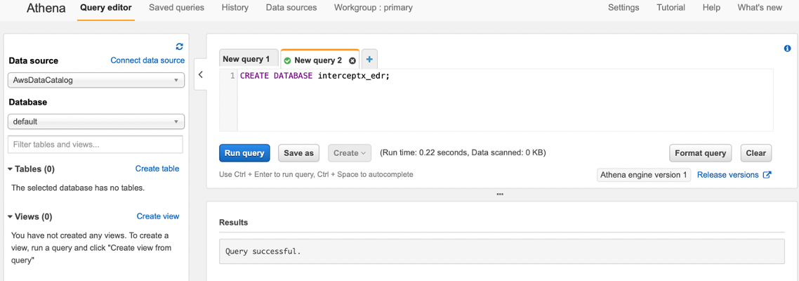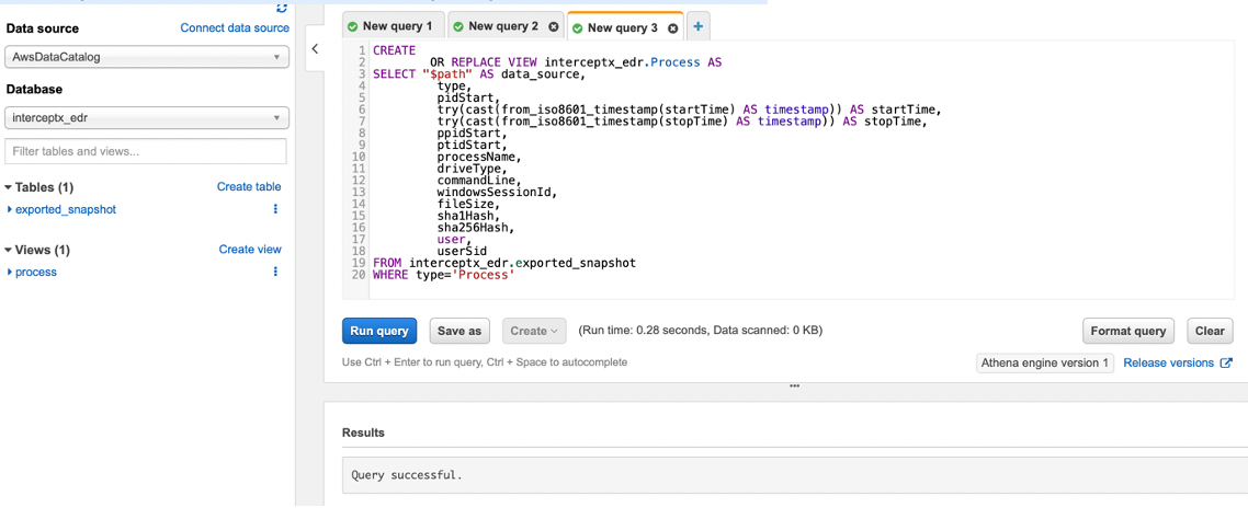 To create these, use the create_views.sql file in the repo and copy out each of the views that you require. You may want all of them, or you may only be interested in a couple of data types such as DNS or Process data for example. Unfortunately Athena doesn’t let you run multiple queries in one window so you will need to create each view individually.