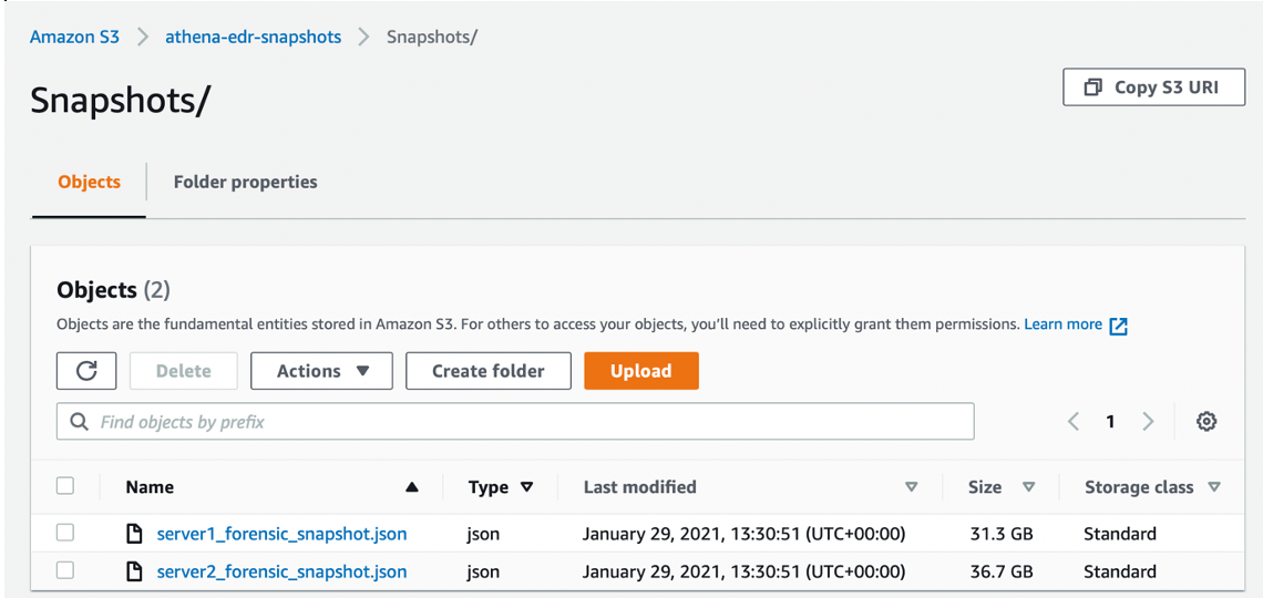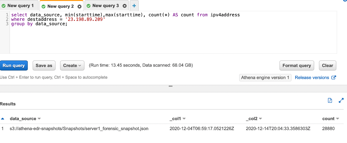 As my snapshots are saved in the bucket “athena-edr-snapshots” in a folder called “Snapshots” I alter the location as shown in the screenshot below (the trailing / is required) and then run it: