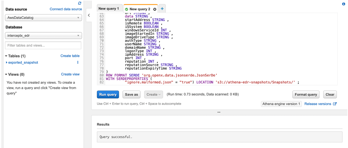 If you got the location correct, you should see that it says “Query successful” and an “exported_snapshot” table appears in your database intercept_edr.